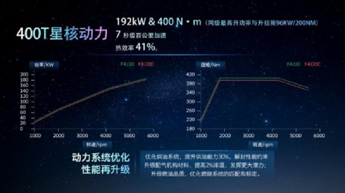 星途品牌实力打造殿堂级动力组合,本次星核动力升级为奇瑞高功率版2.0T动力,相比于原来,采用了超高压油泵、升级了配气机构材料、并优化了燃烧系统的匹配和标定,使得供油能力提升了30%、排温能力提升了2%,实现了最大功率192kW,峰值扭矩400 N·m,具备同级最高升功率96KW与升扭矩200N·m,热效率高达41%,百公里加速仅7秒,配合覆盖多场景的三种驾驶模式,为用户带来媲美合资豪华品牌的动力特性与驾驶质感。