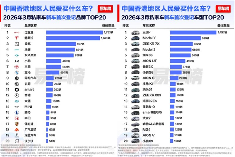 【智车网】2026年伊始,比亚迪在香港市场捷报频传。易车榜数据显示,3月,比亚迪以1763辆的成绩登顶香港汽车市场全品牌销量榜首,其中元UP单车贡献1497辆,成为当月最畅销车型。