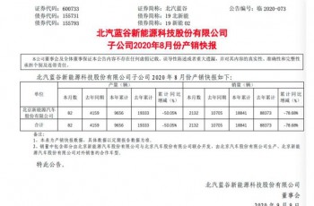 9月9日晚间,北汽蓝谷发布8月产销快报。数据显示,北汽蓝谷子公司北京新能源汽车股份有限公司8月销量为2123辆,比去年同期的10705辆下降80.08%;今年1月至8月的累计销量为18841辆,同比下降78.68%。产量方面,8月北京新能源汽车股份有限公司仅生产82辆,去年同期为4159辆;1月至8月共生产9656辆,同比下降50.05%。