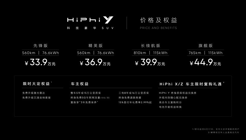 高合家族主力舰车型HiPhi Y自上市以来,收获广泛好评。高合HiPhi Y首次亮相成都车展之际,以极具诚意的产品配置与购车政策回馈广大用户,让豪华体验触手可及。截至8月31日,支付大定并锁配的用户,尊享多重礼遇:整车5年或15万公里质保、三电8年或16万公里质保、终身免费5G车联网流量(10G/月)、终身免费道路救援、置换享“3年免费保养”、15%首付年化费率2.99%起。除上述权益外,高合HiPhi Y 560km先锋版及810km长续航版车主还可免费升级至价值8000元的沉浸音响套装及8000元的激光雷达。为感谢高合用户一如既往地支持,HiPhi X及HiPhi Z车主复购HiPhi Y还可获赠4项专属限时礼遇。各项权益详情可登陆高合App或至全国高合体验店了解。