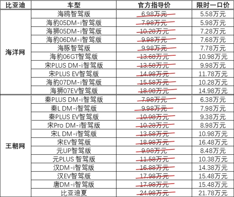 【智车网】近日,比亚迪官方再推出限时“一口价”或限时补贴的促销活动,涉及王朝网、海洋网共计22款智驾版车型,最高补贴优惠可达5.3万元。