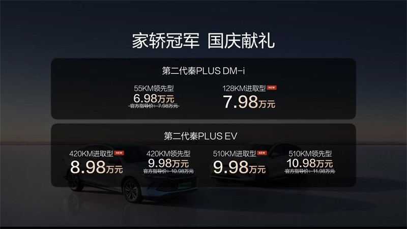 【智车网】9月25日,比亚迪第二代秦PLUS双车上新,发布了秦PLUS DM-i 128KM进取型、秦PLUS EV 420进取型、510KM进取型等三款新车,同时全系车型享国庆献礼价,限时6.98万元起。