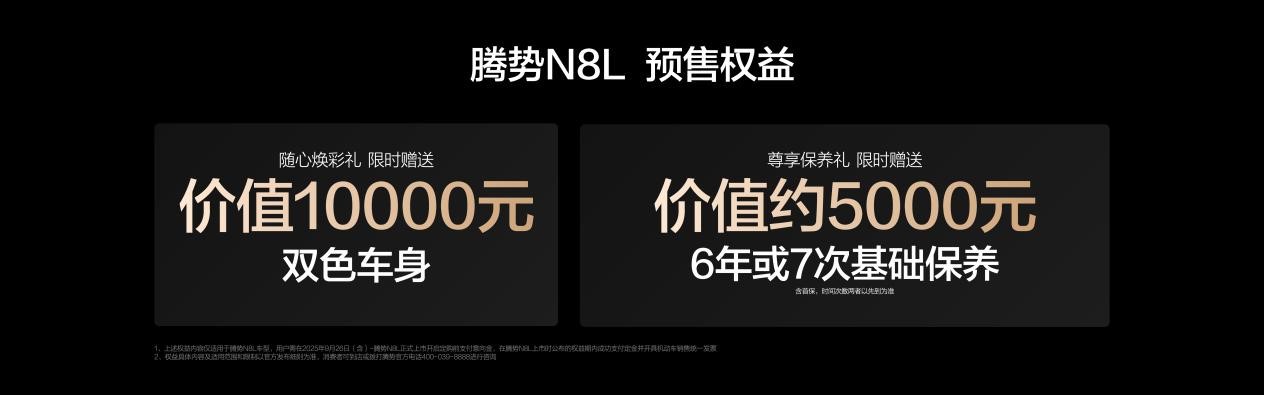 【智车网】9月26日,腾势汽车全新大六座安全豪华SUV——腾势N8L正式开启预售,预售价31.98万至34.98万元。作为与科技安全旗舰SUV腾势N9一脉相承的家庭豪华伙伴,腾势N8L与腾势N9共同构成了腾势品牌独有的旗舰豪华双子星矩阵,分别瞄准不同细分市场。腾势N9定位科技安全旗舰SUV,科技力拉满、豪华感给足,更追求旗舰的科技性能。腾势N8L则是更聚焦家庭的安全豪华SUV,继承了N9的安全技术和灵活驾控,有大空间和豪华感,更追求家庭的豪华舒享。