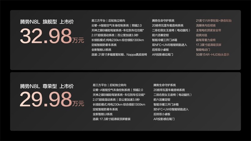 【智车网】10月28日,“大六座安全豪华SUV”腾势N8L正式上市,共推出2款车型,官方指导价为29.98万元~32.98万元!N8L全系标配“六大核心科技”,以超越传统豪华的品质标准,诠释家用车的豪华感、安全感与科技感,创造让全家人动心、舒心、省心、安心、暖心的出行体验,以“五心体验 三感相伴”,定义美好出行。