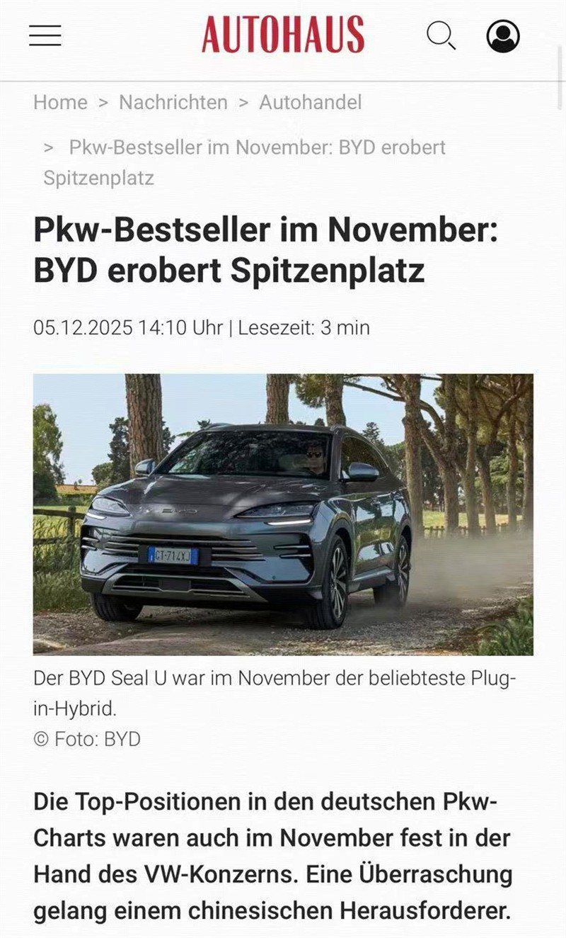 【智车网】近日,BYD SEAL U(宋PLUS)成为德国11月车市插混车型销量冠军,引发行业广泛关注。这不仅是中国汽车品牌首次在德国主流细分市场登顶,更意味着比亚迪在欧洲的发展规模已进一步提升。